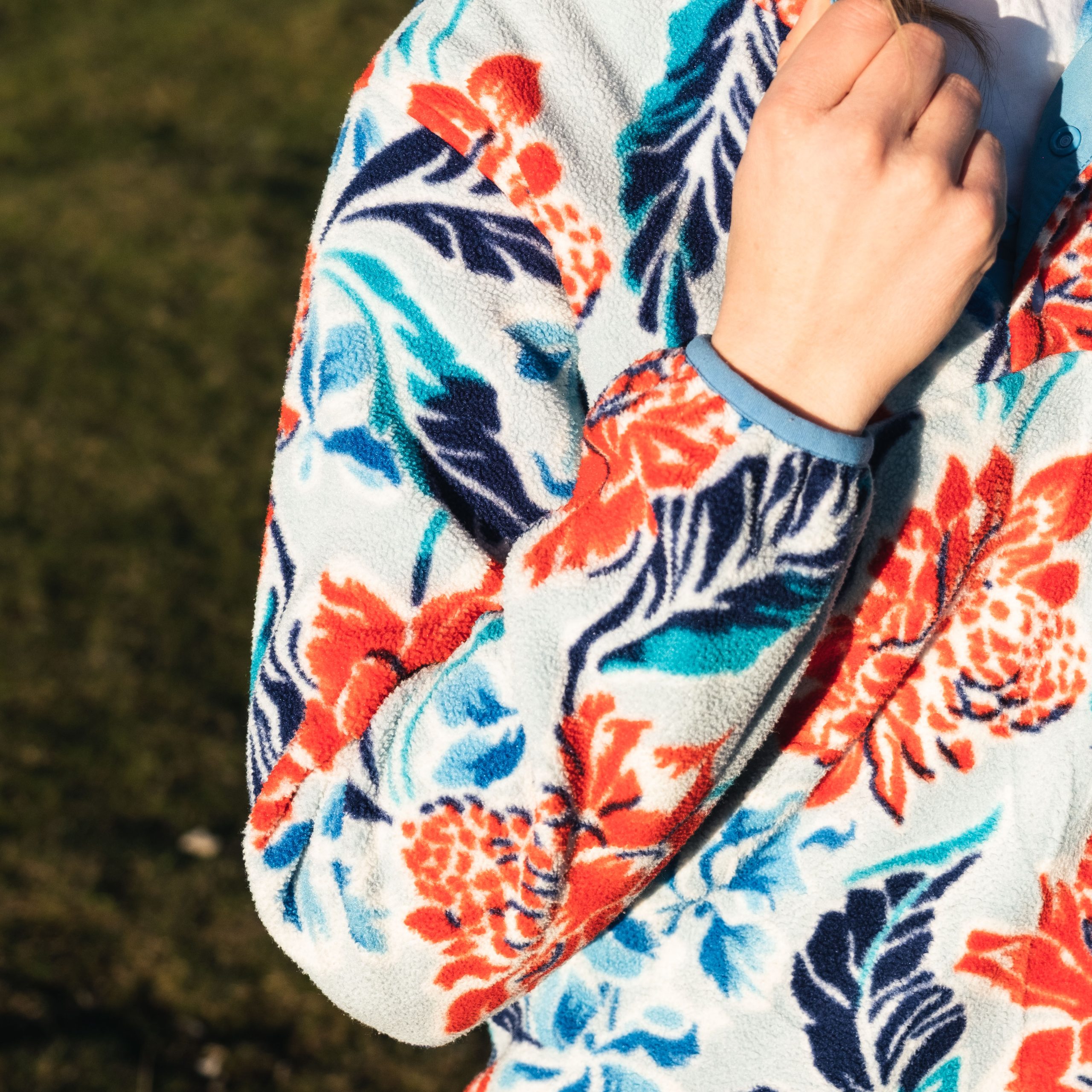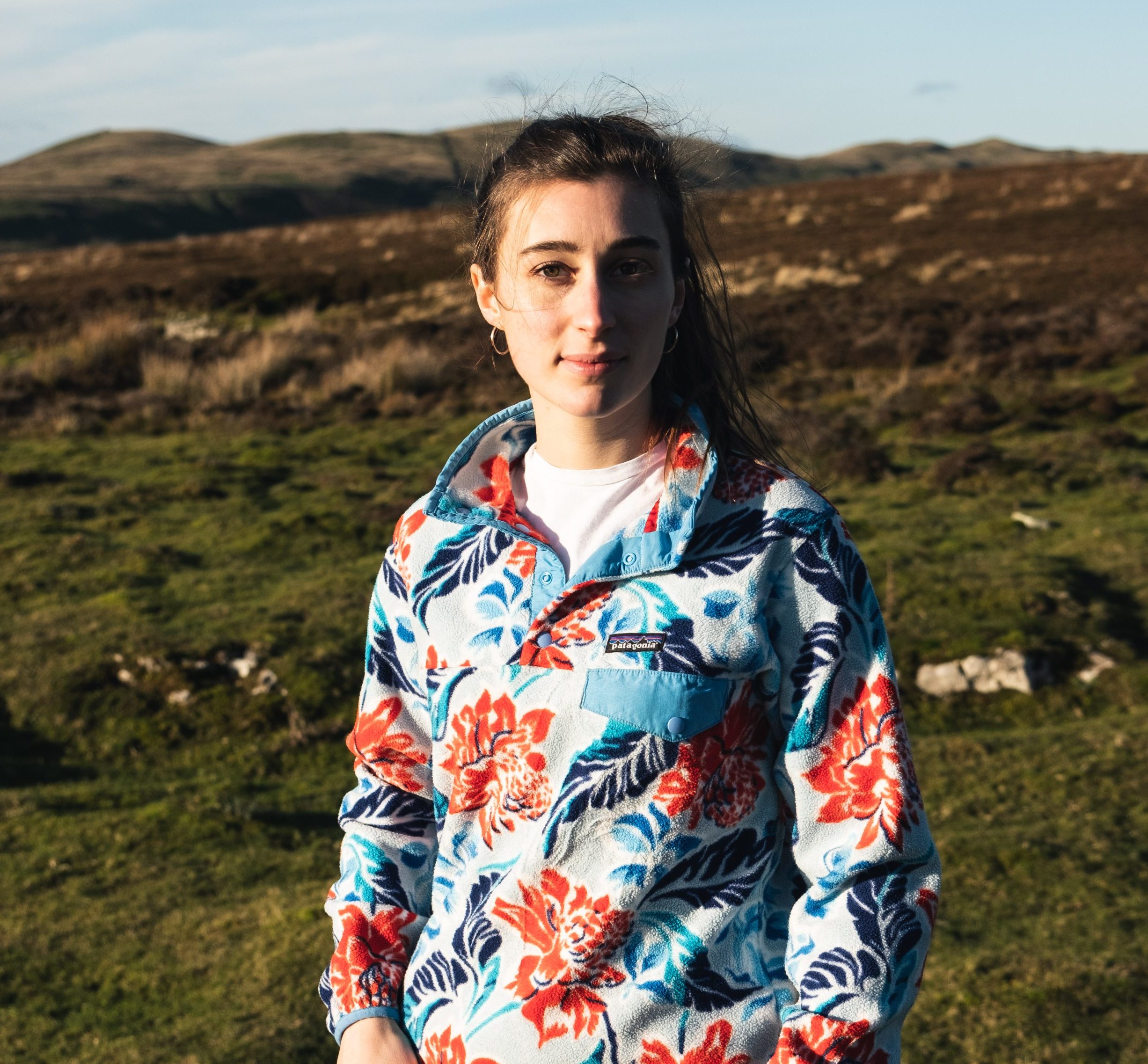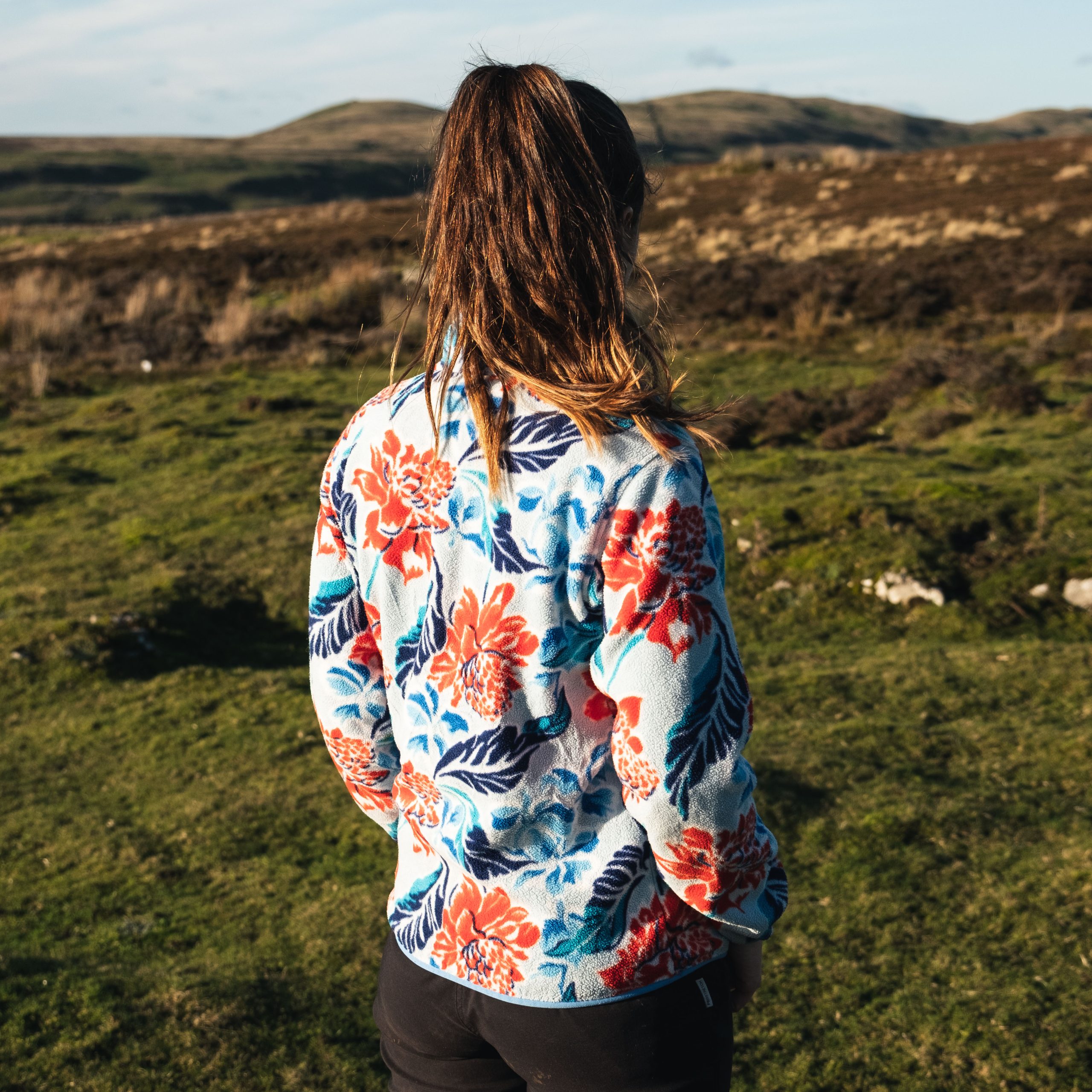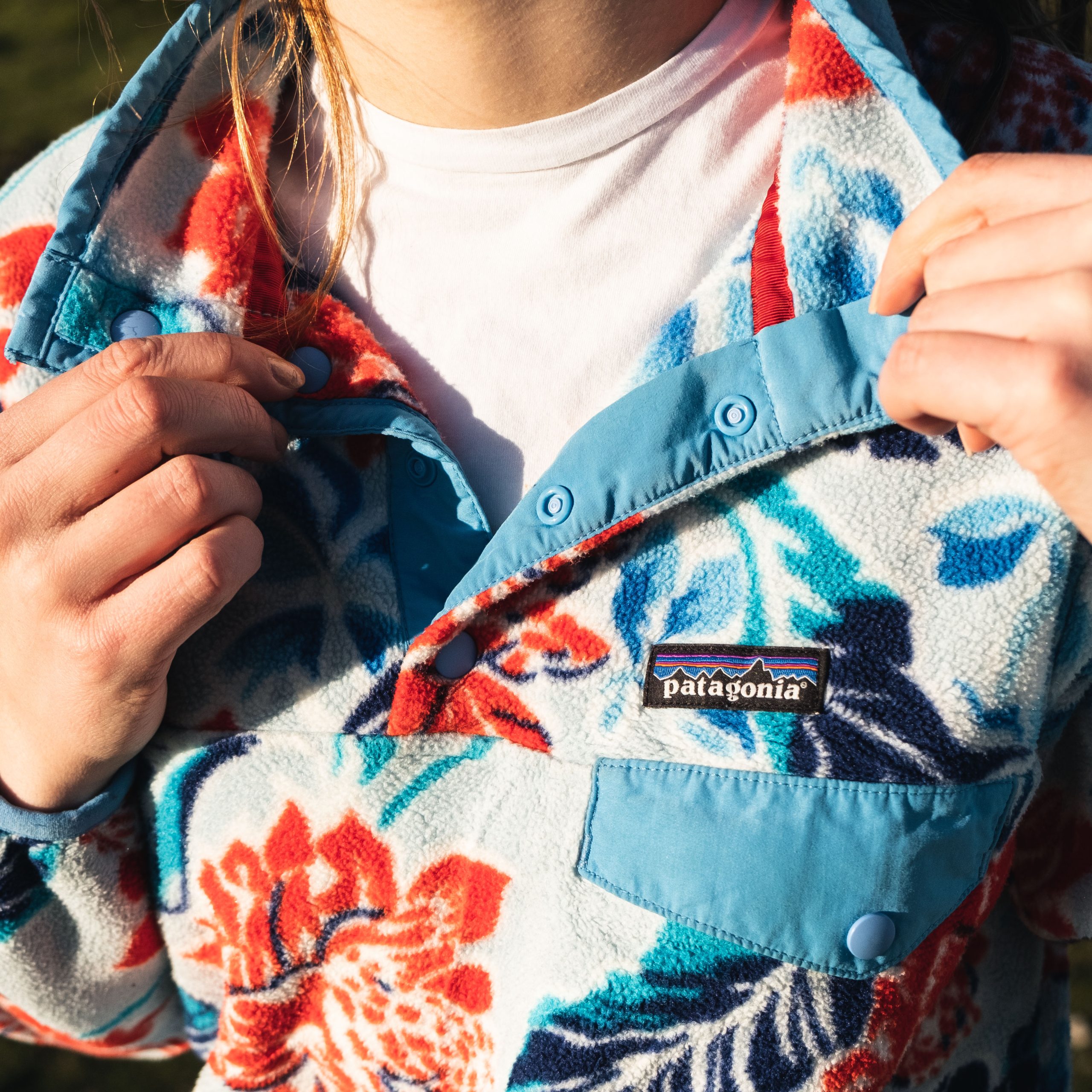 – Patagonia Snap-T synchilla fleece in a the blue, white and rose pattern.