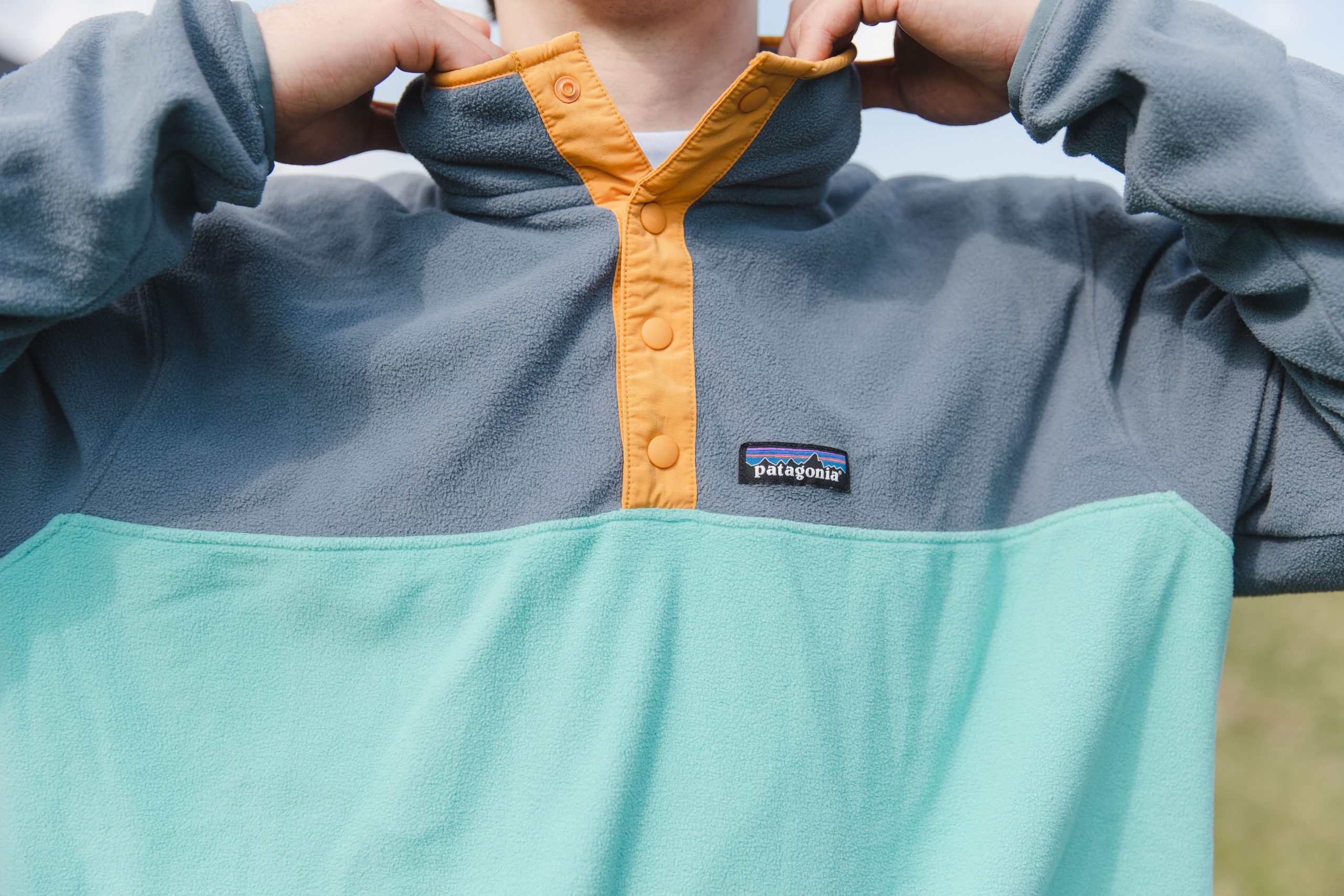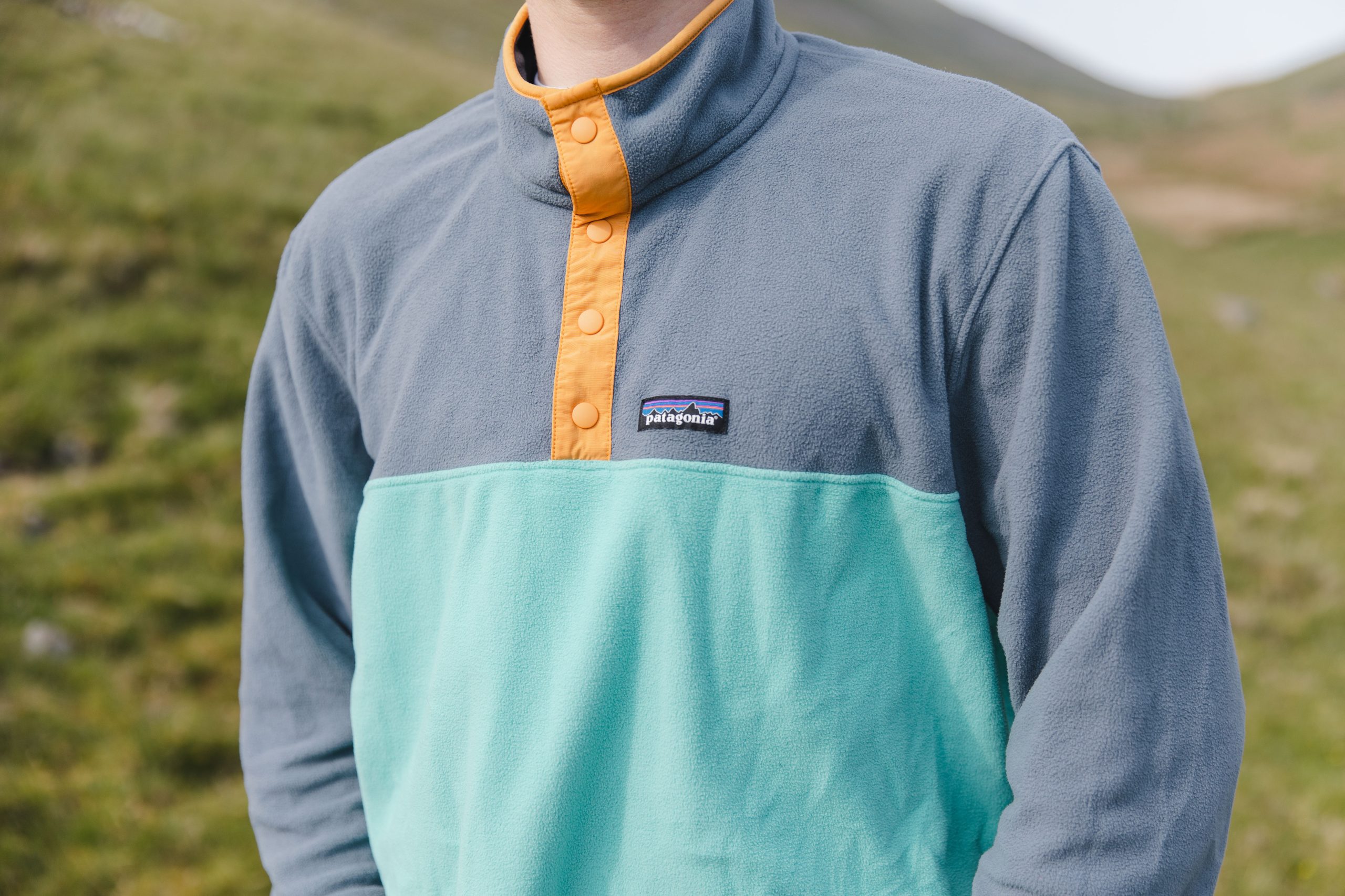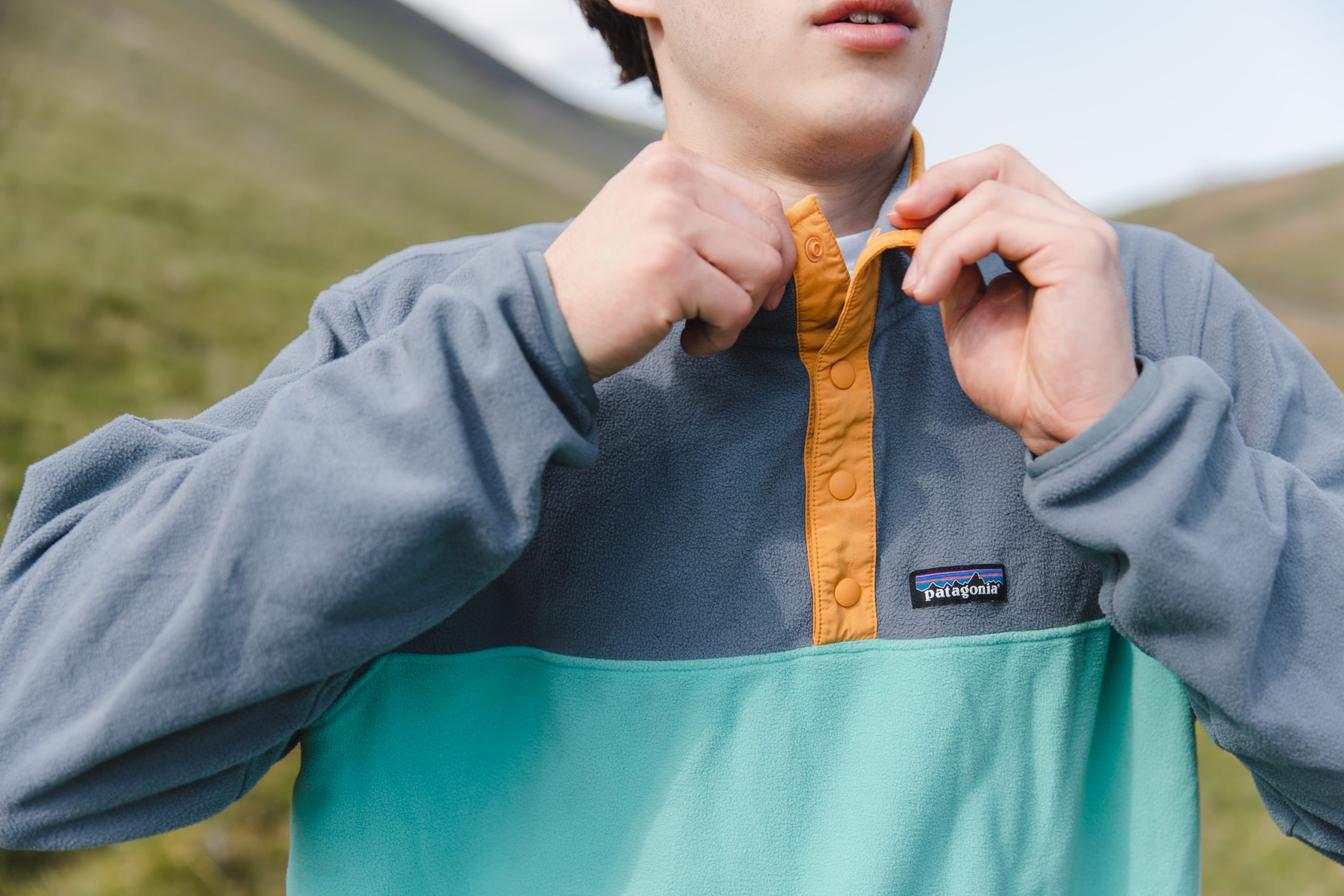 – Patagonia Snap-T Synchilla Fleece in the two-tone teal and aqua colourway with ochre trim on the collar