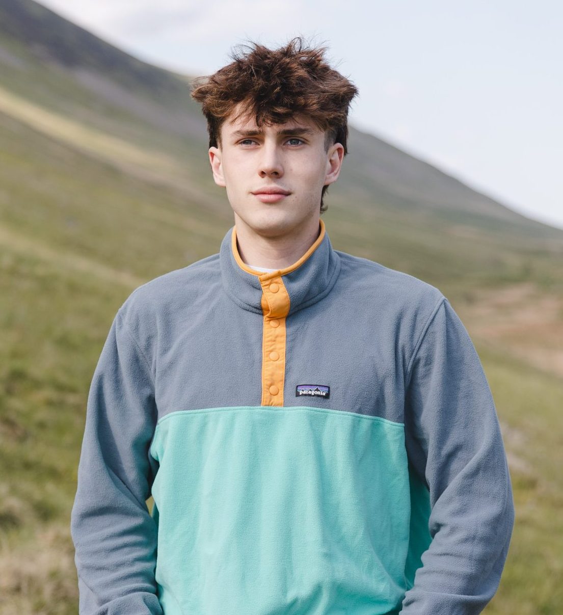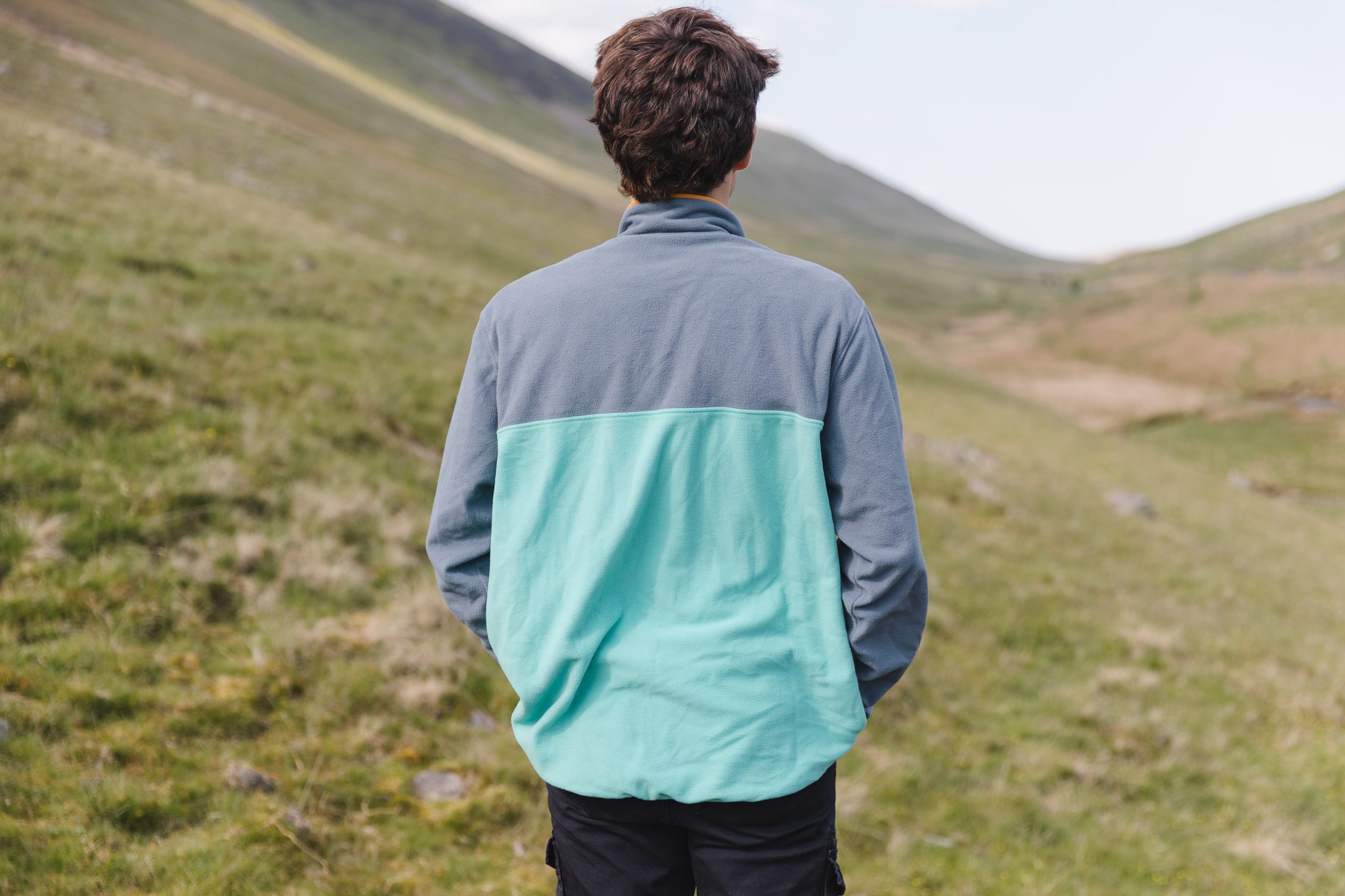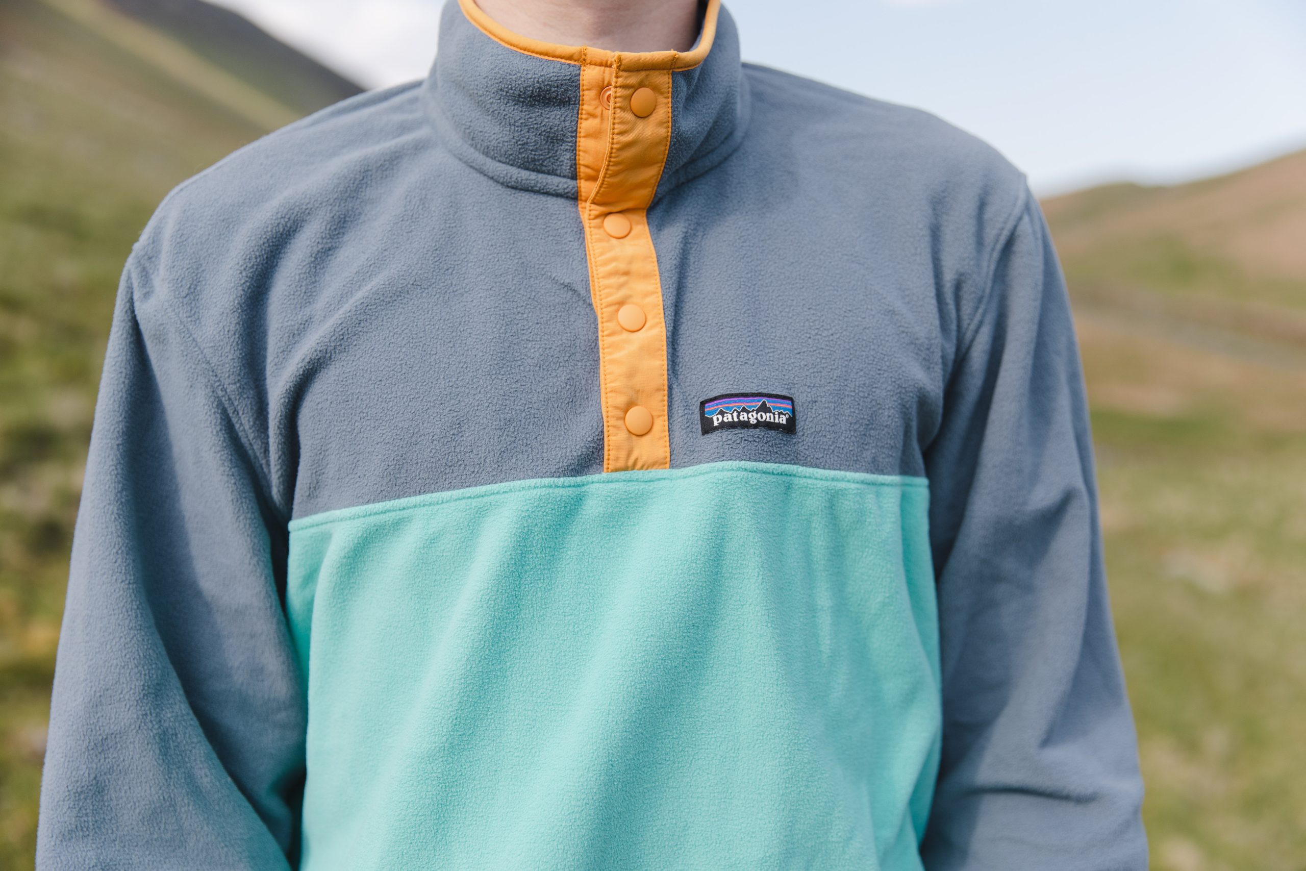 – Patagonia Snap-T Synchilla Fleece in the two-tone teal and aqua colourway with ochre trim on the collar